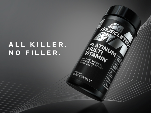 Multivitamin Platinum , Muscletech , 90 Caps Contiene un paquete completo de vitaminas y minerales compuesto por Vitamina A (como acetato de retinol y betacaroteno), Vitamina C (como ácido ascórbico y ascorbato de calcio), Vitamina D (como colecalciferol), Vitamina E (como acetato de DL-alfa-tocoferol, acetato de D-alfatocoferol), Tiamina (mononitrato de tiamina), Riboflavina, Niacina (como niacinamida y ácido nicotínico), Vitamina B6 (como piridoxina HCl y piridoxal-5-fosfato), Ácido Fólico, Vitamina B12 (cianocobalamina), Biotina, Ácido pantoténico (como D-pantotenato de calcio), Calcio (como carbonato de calcio y citrato de calcio), Magnesio (en óxido de magnesio), Cinc (como óxido de cinc, quelato de aminoácidos de cinc), Cobre (aminoácido quelato de cobre), Manganeso (como sulfato de manganeso monohidrato), Molibdeno (como aminoácido quelato de molibdeno) y Potasio (cloruro de potasio).
