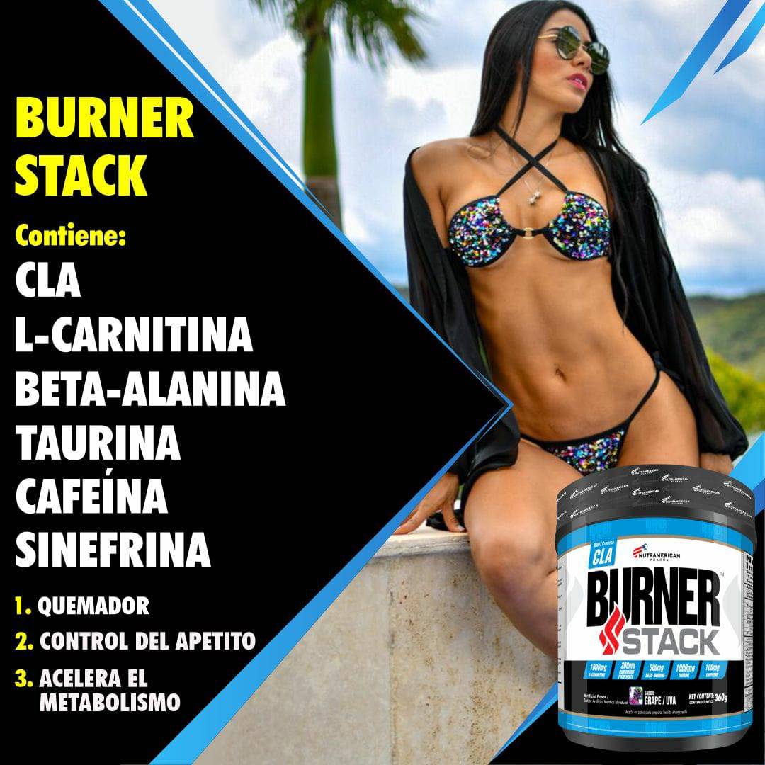 Burner Stack es una bebida energizante que contiene 15mg de extracto de naranja amarga, 100mg de cafeína, 1000mg de L-carnitina, 500mg de CLA, 1000mg de taurina y 100mg de goma guar, con un delicioso sabor a uva. Fabricado por Nutramerican Pharma.