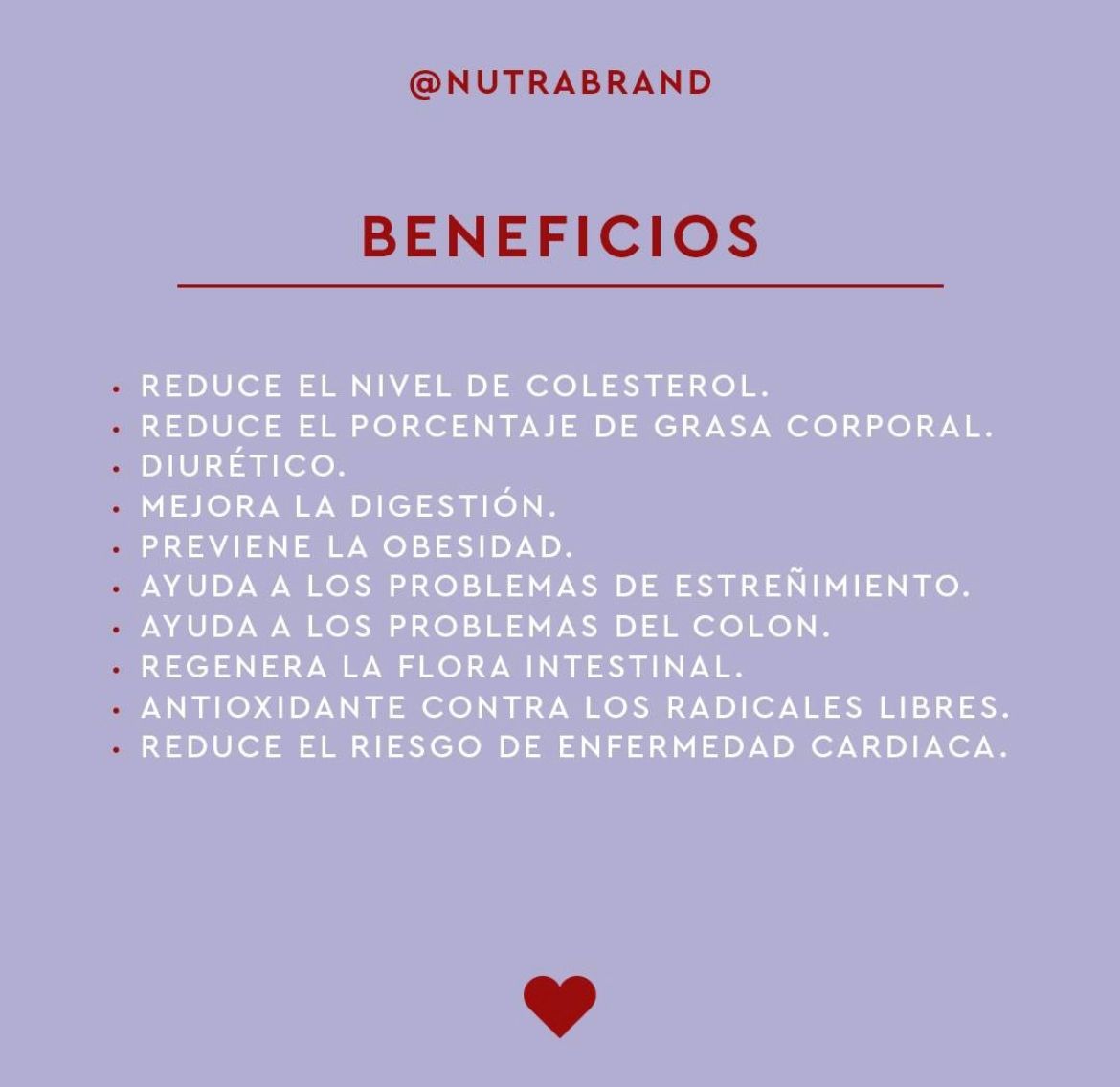 Aporta fibra soluble , ayuda a controlar el apetito , permite regular la insulina, produce efecto reductor del colesterol, funciona como laxante y previene el estreñimiento