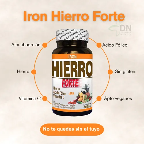 Hierro Forte Iron es un suplemento nutricional formulado para apoyar los niveles adecuados de hierro en el organismo, contribuyendo al bienestar general, la energía diaria y el correcto funcionamiento del sistema inmunológico. Su fórmula combina hierro de alta absorción con ácido fólico y vitamina C, nutrientes esenciales que trabajan de forma sinérgica para optimizar su aprovechamiento por el cuerpo.