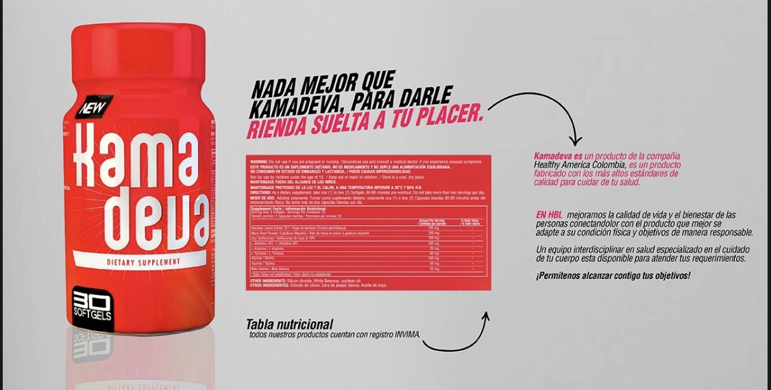 Kama Deva novedosa fórmula especializada para la salud sexual de las mujeres que contiene isoflavonas de soya, fenogreco, maca, L-Arginina, taurina, L-Tirosina, L-Histidina HCI, beta-Alanina, glicina.
