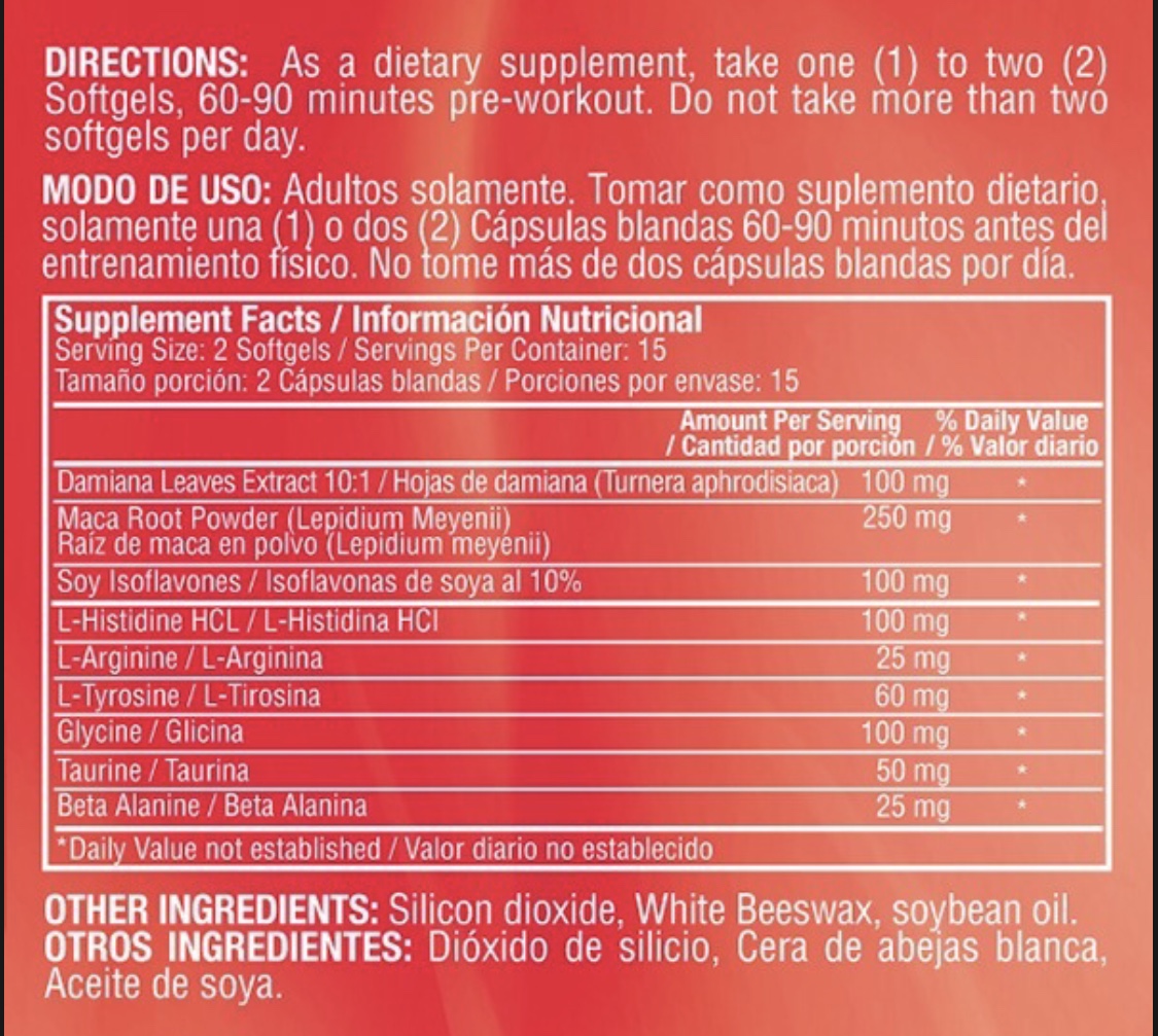 - Estimula la producción de hormona del crecimiento, que regula el deseo y la función sexual; mejorando la seguridad, el humor, la respuesta sexual, la resistencia física y disminuyendo el estrés. Por lo cual disminuye la fatiga crónica, combate la frigidez, y aumenta el apetito y la potencia sexual; gracias a su contenido de maca, fenogreco, L-histidina HCI, de l-taurina, beta-alanina, y de L-tirosina, que aumenta los niveles de neurotransmisores como dopamina, norepinefrina, epinefrina y L-dopa.