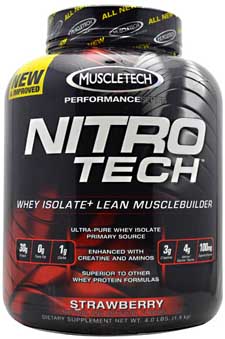 Nitro-Tech Performance Series de Muscletech es un suplemento a base de aislado de suero diseñada con una fórmula especial para construir músculo magro libre de grasa. Nitro-Tech es el aliado perfecto para todos los atletas que están buscando más músculo, más fuerza y mejor rendimiento. Contiene proteínas de origen principalmente de proteína de suero y también se ha mejorado con la forma más estudiada de la creatina para acelerar el aumento del músculo y la fuerza.