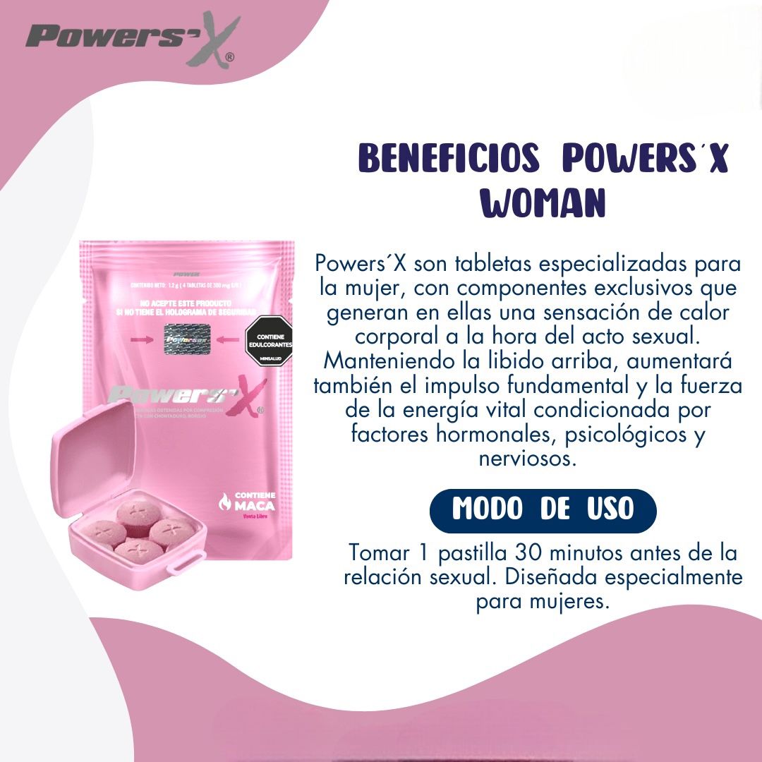 Powers’X Women es un energizante basado en frutas y plantas que intensifican las virtudes de los nutrientes afrodisíacos más reconocidos a nivel mundial, favoreciendo la producción de factores hormonales que actúan en el organismo de manera natural para aumentar el deseo y la sensación de placer sexual en la mujer.