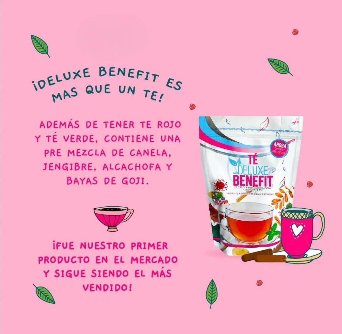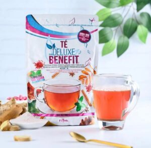 Te Deluxe Benefit es una Mezcla en polvo para preparar deliciosa bebida de Té instantánea. Es una infusión de extractos naturales para controlar la ansiedad, eliminar líquidos retenidos, desinflamar la zona abdominal, acelerar el metabolismo y reforzar el proceso natural de la LIPÓLISIS (movilización de las grasas o hidrólisis de triacilglicéridos). También actúa como antioxidante natural y reforzador del sistema inmunológico. Es una increíble opción para tomar entre comidas. Lo mejor de todo es que aumenta la actividad del sistema nervioso de forma positiva, lo que ayuda a mejorar el humor cada día y a evitar depresiones.